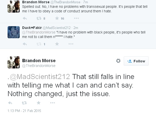 Brandon Morse says something transphobic--4 people retweet it and 11 people favorite it--and that hugging fuels Brandon to say the next thing. And the next thing. That is The Job. That stuff beneath where people, like, question the ideas? Addressing that is not the proper work of Brandon Morse. Or the Escapist or anyone else who ever used the "I was just giving my opinion on my blog jeez isn't this a free country any more?" excuse. You are here to advertise ideas, not use them.