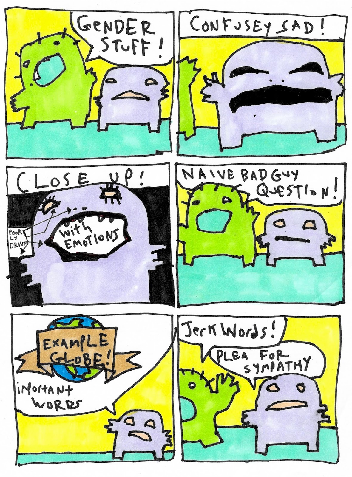 Ok, some games go a little farther than that. Sometimes the players’ section also gives you a few paragraphs about creating a character backstory or coming up with character goals and story hooks, but it firmly falls into the preparatory “character creation” step of role-playing. If the rules tell you anything at all about how to play your character once the game begins, it’s all very generic surface-level characterization stuff, like “use an accent” or “give the character a distinctive mannerism or nervous tick” or “masturbate vigorously when your character triumphs.” Most game books tell you how to create a character sketch, but offer very little information about how to tell a story with that character. They help you create an action figure, but don’t tell you how to play with it. If you’re mostly interested in the strategy game aspect of role-playing (hacking monsters, solving puzzles, that kind of thing), that’s probably all you need. If you want to focus more on storytelling, it might not cut it.