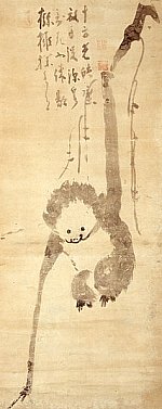 While those Chinese monkeys up there have the good sense to repose for the unknown painter in both the loquat tree and the composition it and they both serve, these Japanese monkeys insist on fucking around. The way they hang almost satirizes the way the scroll hangs from the wall.