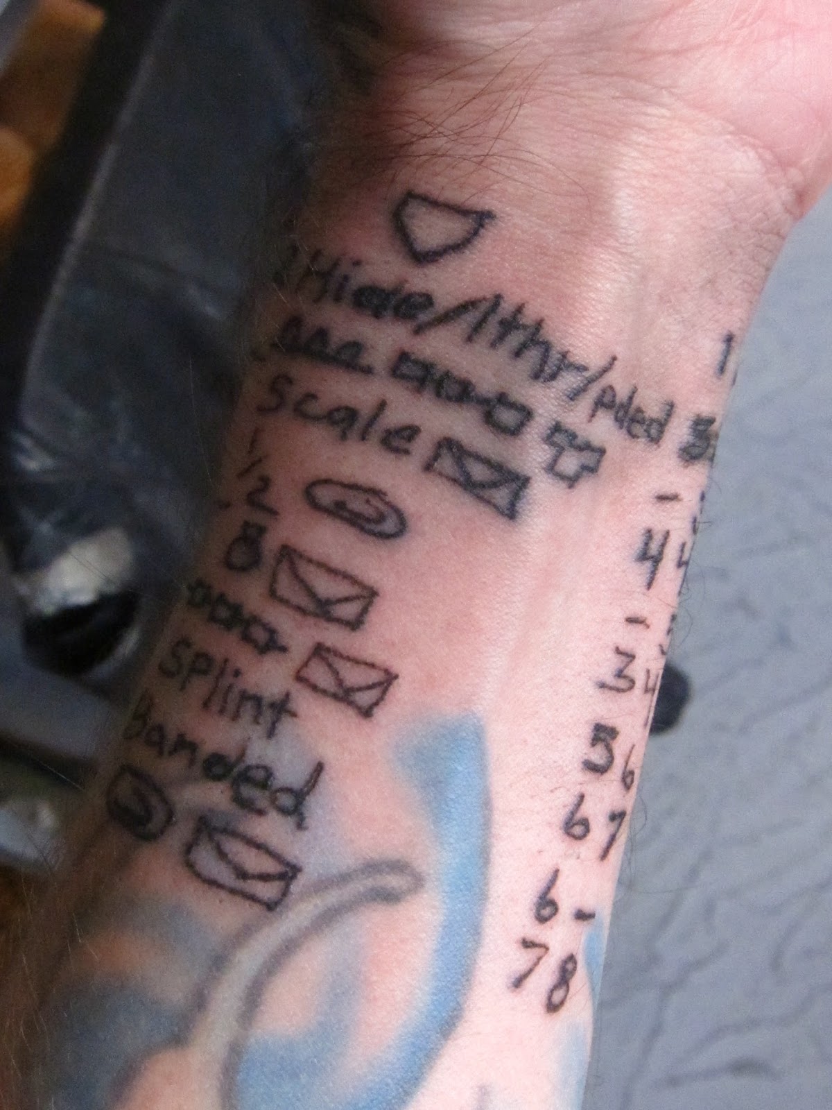 5th edition armor classes don't line up with AD&D/Labyrinth Lord armor classes, plus I can't remember any of them anyway, so I just had Connie tattoo them both on my forearm.