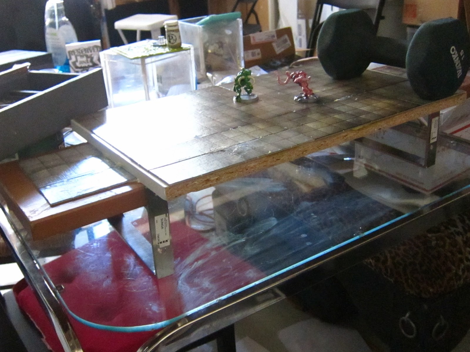 And I got out some wood glue and stuck some dungeon tiles on some leftover shelf bits because I was thinking it might be nice to have a sort of second smaller table to stick on top of our actual table so that there'd be more room for snacks.