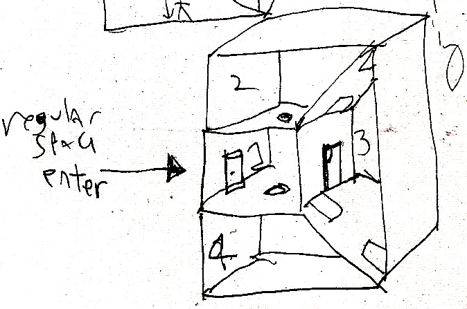 So, in order to explain to myself and you how this works a little easier, I've just taken half of the thing and made a minidungeon out of it. You enter from normal space through the door where I've written a totally crunk "1": (side cutaway view)