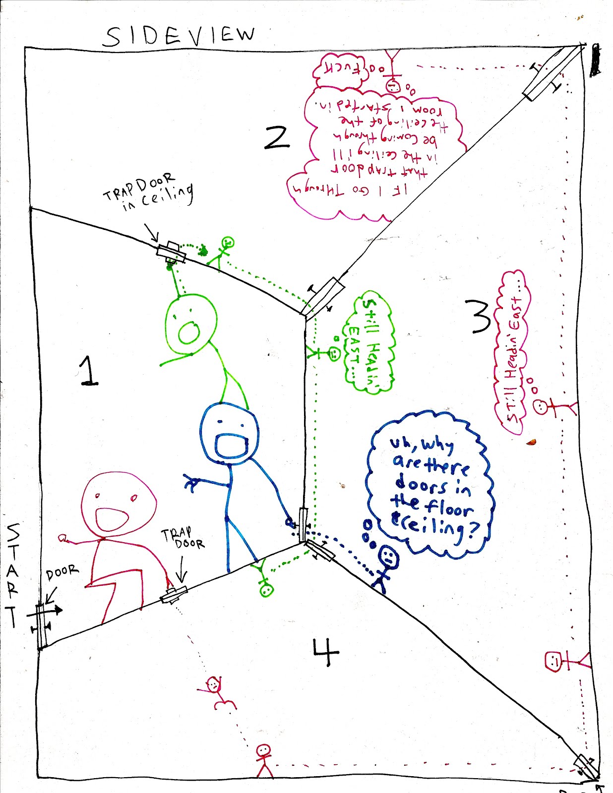 Also helpful to remember: people fall in the direction of their feet. So for example if Blue opened one of those doors on the floor in room 3 and went through, Blue would wall toward that vertical wall on the bottom left (the surface parallel to and opposite the door he just opened, since the room is "straightened out" from his point of view).