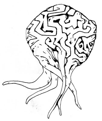 Erected on the edge of these ruins to the northeast, well away from the main camp, are three large poles. Each pole is 10 feet tall and carved with crude faces of the different creatures that have formed theancestry of the mongrelmen. In each pole, a large metal ring is set at about a 7’ height. Sacrifices are brought here, fastened to the poles and left to die. Monsters have learned that easy prey can be gained here; therefore, the chance for an encounter is 25% each turn.