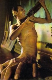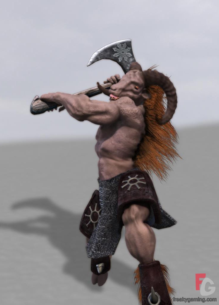 The door from the guard room creaks, but gives, and behind its ancient portal stands the huge metal statue of a fully armed warrior. The figure's arms are raised behind its head, menacingly brandishing a curved sword,with a blade at least five feet in length, in a manner that threatens an imminent strike. Before the statue rests a large block of wood. Deeply stained on its upper surface, the wood contains four shackles,one at each top corner, and a large cut running down its upper length.