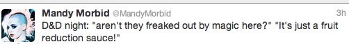 | (Likely also abetted by the fact that when Laney jabbed him with a poisoned rapier I represented his acidic vomit by spitting on the table. I'm awful.) |